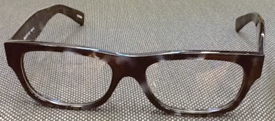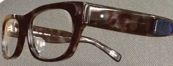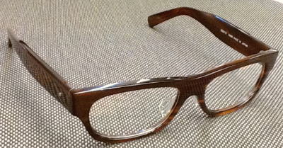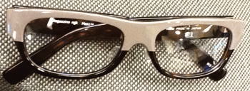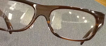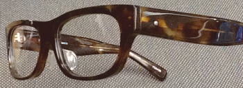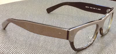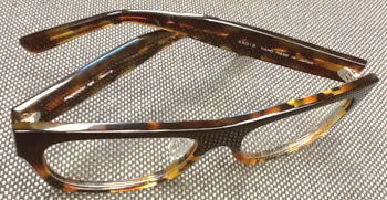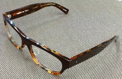 べっこう柄のデミを暗い青に染め上げた素材を再現。